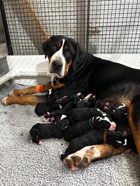 We do not currently have any Greater Swiss Mountain puppies available at this time. We are planning for 2 litters spring of 2026 (April/May approx due date). We are accepting limited deposits on female puppies for these litters. Should we have male availability we will contact families that want to be added to the male waitlist!